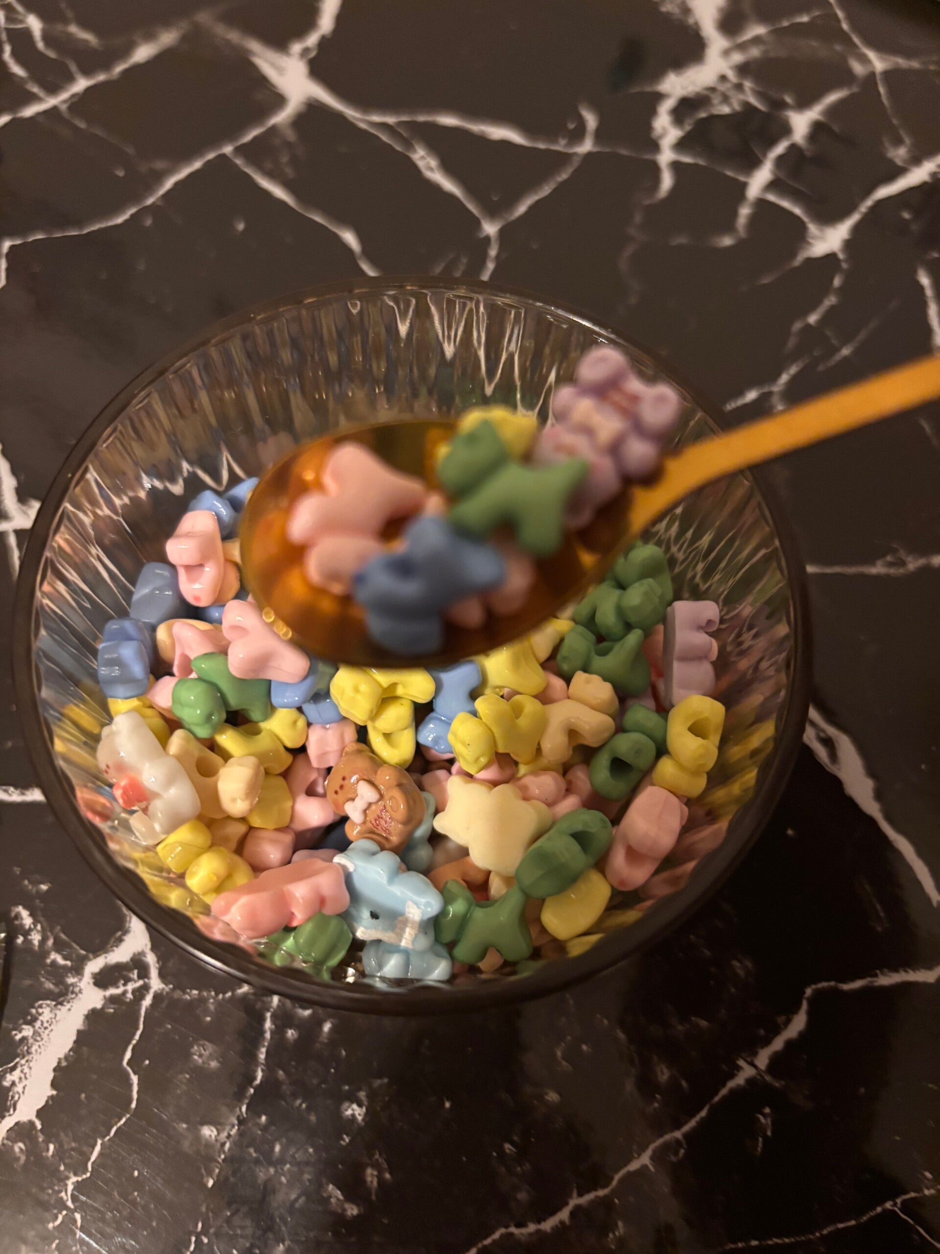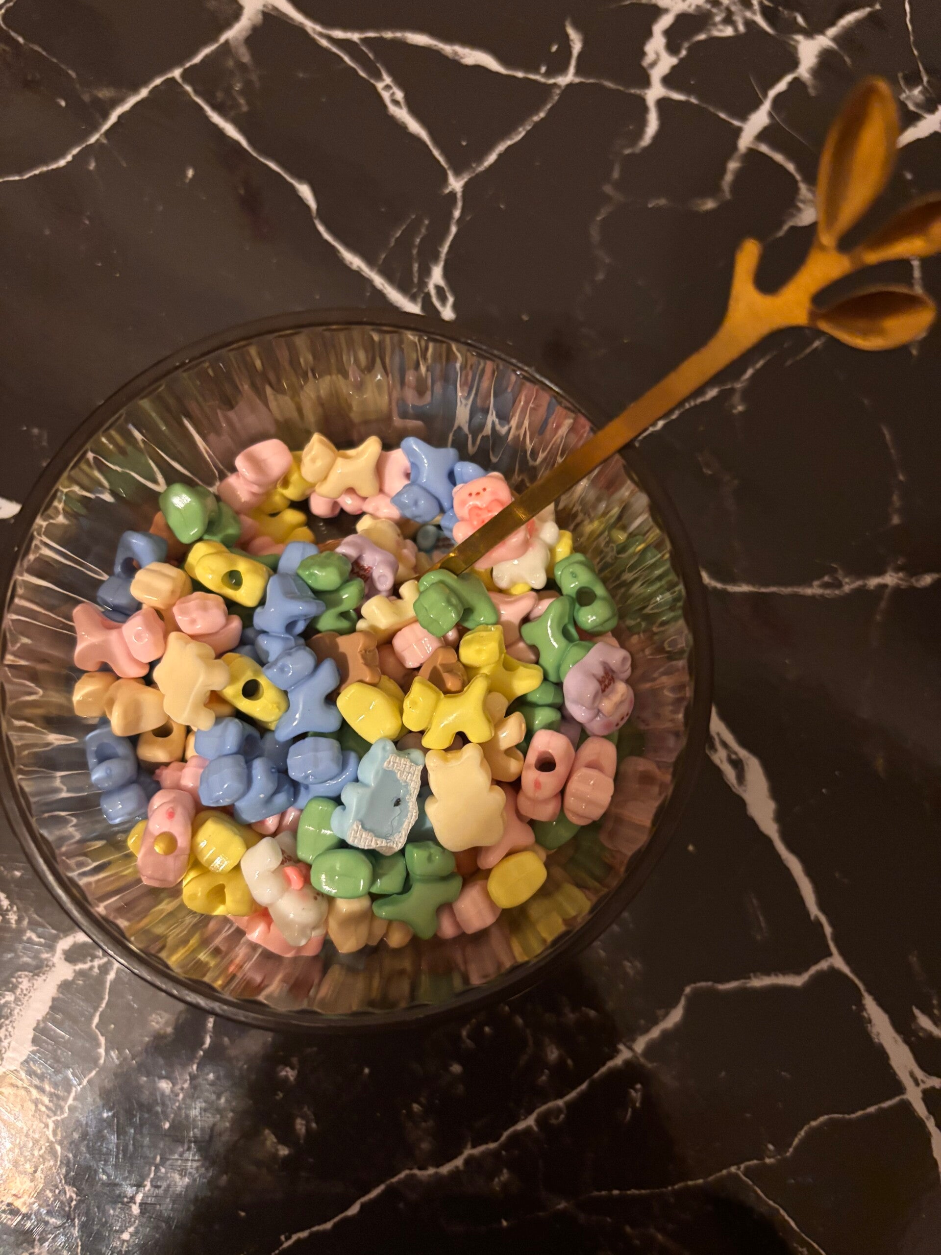 Using a spoon, we scoop up a handful of colourful beads from our mystery pot. Each bead represents how many blind bags you will get with a jewelry inside.It’s a game of pure luck — no items are guaranteed.